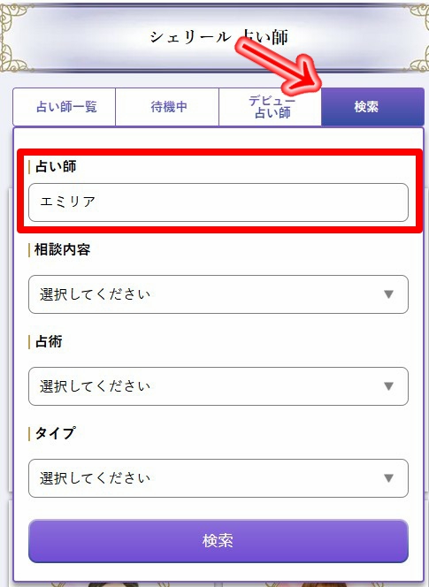 ログイン後、検索窓に「エミリア」と入力し、先生を見つけます